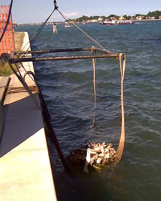 I went to discuss all this with Lino, and when he came over to investigate, we saw that the waves had pulled the wreath away from its temporary resting-place and had drawn it seaward, right into the center of the straps attached to the crane which puts our boats into the water.