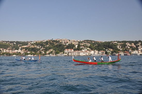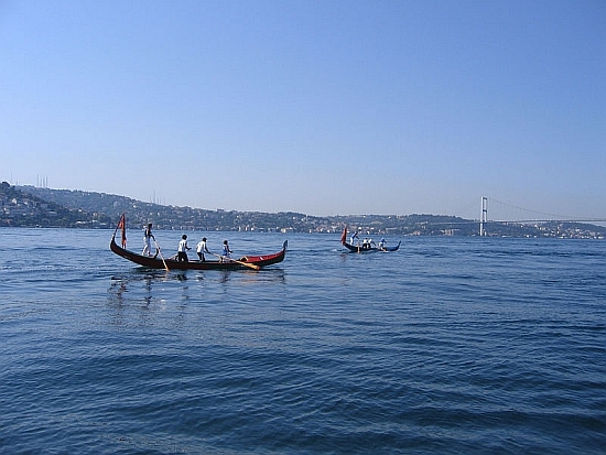 Gondolas on the Bosphorus — how weird is that? Despite the fact that, somewhere back in history, there were plenty of boats our size being rowed all around here, we were thrillingly tiny. Under the soaring Fatih Sultan Mehmet suspension bridge the passing ocean-going tugboat and the double-decker tourist boats and the random tanker, all of which seemed to have three-million-horsepower motors and created waves the size of Quonset huts, made rowing a fairly unusual thing to be doing out here. Possibly the people aboard the aforementioned craft thought so too, though I’m not sure we even showed up on their radar. Certainly the tourists were excited to see us, waving and snapping pictures, though only God knows what they were thinking as we passed. They certainly weren’t thinking about the massive wake they were leaving behind them.