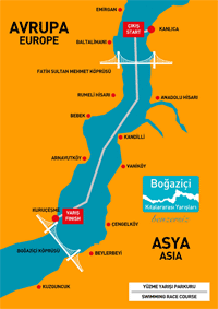 - This is the Bosphorus at its peerless best. We are toiling toward the Bosphorus Bridge, the second of only two across the strait. The finish line was almost in sight (imagine applauding hordes to the right of the frame). Courtesy Olympic Committee of Turkey