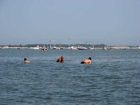 The first time I saw this phenomenon I was taken completely by surprise. Looking from the Lido across the lagoon toward Venice, I saw, instead of the usual expanse of grayish-greenish-blueish water, a vast swath of brilliant emerald green, dazzling marine vegetation gleaming in the sunshine. It was like seeing Nebraska with bell-towers. Of course I knew that the lagoon bottom wasn’t as empty and flat as the high-school swimming pool, but seeing it was astonishing. I was hooked.