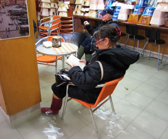 We hadn’t even reached the end of the fondamenta before we got inconfutable evidence that in spite of the blasting wind and rain and water up to our thighs that the tide had turned: Under the boats, the anguele (Atherina boyeri) were all facing upstream, against the tide.As usual, somebody had left a bag of garbage out on the street. You can’t pick them all up as they float around and away, but this was the first one we came across and Lino decided he had to do something about it. Nobody would have noticed, or cared, but I was impressed and I know he felt better.The owner of our favorite cafe didn’t even try to keep the water out, though she did take all the boxes of panettone out of the window display and stacked them up on the counter along the wall. As she told us later, there’s no point in putting a barrier across the door — the water just comes in some other way. In the case of the cafe across the street, jets of water were coming in through fissures in the wall even as he was pumping the water out. Meanwhile, this lady is here every day, reading. Why let a little water ruin a perfectly fine routine?