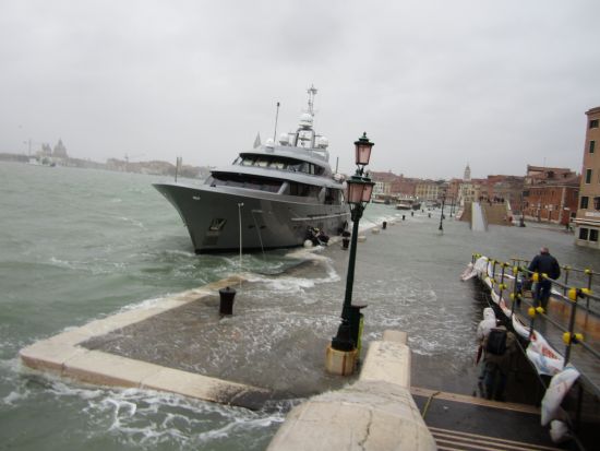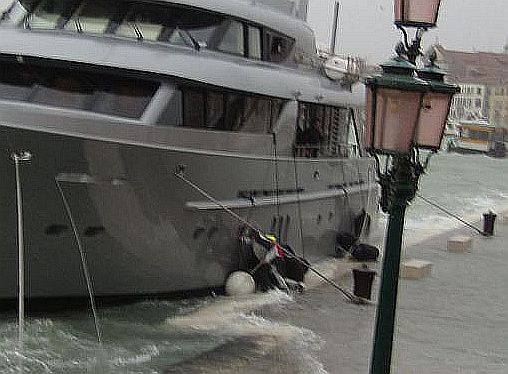 Someone pauses to assess the situation as we near the edge of the Riva. As you can tell, there’s relatively little to assess. If you’re still standing up, you’re okay.The only yacht moored near the Arsenal was in a fairly unpleasant situation. Perhaps the waves wouldn’t have lifted it up onto the pavement, but it was making progress to having its expensive hull well and truly bashed and dented. The only two people on board were working like madmen to push the fenders between the stone and the metal. But it was a doomed endeavor. Why? Because the wind and water were pushing against them, and for some incomprehensible reason they had not slackened one of the lines attaching the boat to the fondamenta. Even if these two were Samson and Hercules, they couldn’t have pushed the boat out further than the rope would let them. And yet they kept trying. I wanted to go say “Untie the line!” but Lino said “Don’t even think of getting yourself involved, for the sake of the souls of all my dead relatives.”I have the utmost respect for the fact that they were giving it all they had to protect the boat (though then again, why it took them so long to remember the fenders is a mystery. The high-water siren sounded at 6:00 AM and it’s now 9:30.) Instinct clearly has taken over, because two people with a combined weight of perhaps 300 pounds couldn’t possibly shift an object weighing at least a ton being pushed by the combined strength of Poseidon and Aeolus. I hope they’re okay today. I hope they didn’t get fined, or fired, when the boss called in to check on his boat.Despite the surging water and lashing waves and all, here is undeniable proof that the tide is falling: Detritus left behind on the steps of the bridges. I don’t usually find trash appealing, but this was a beautiful thing to see.