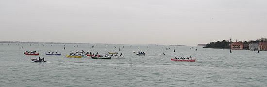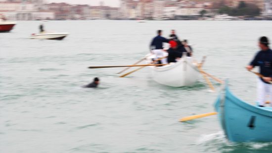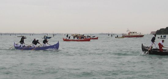 The course was inverted this year, as the tide was coming in (it’s always much better to start against the tide), so the race started in front of the Piazza San Marco, proceeded at a great rate toward Sant’ Elena, where the boats rounded the buoy and headed toward the finish at the Arsenal. The first two boats are already battling it out, while the team on the pink boat is probably discussing what to give their girlfriends or wives for Christmas. Not much else to talk about back there.I’m sorry we can’t hear what opinions the teams on the first two boats are sharing with each other. Believe me, there can be as many insults yelled at your teammates as at your opponents, even if you’re in the lead.
