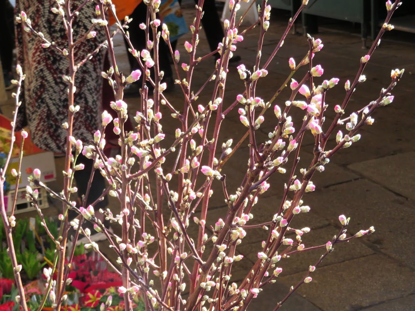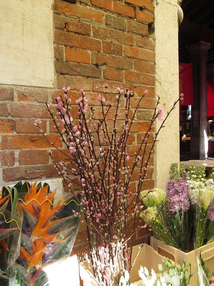Moving toward Easter (which also moves every year, try to keep up), the peach blossoms arrive, often from Sicily, or even from somewhere in the Veneto. It must depend on the weather. I only see them at the Rialto market.