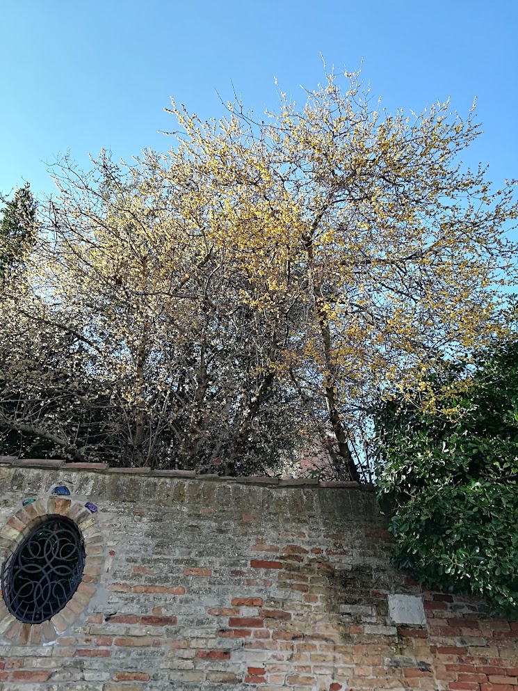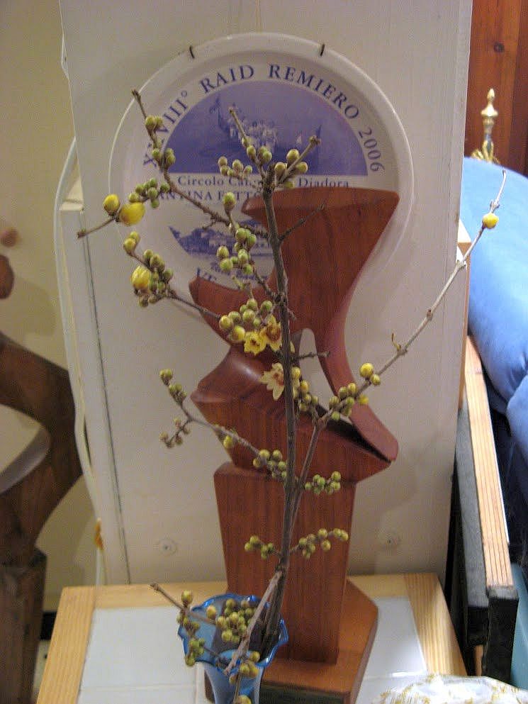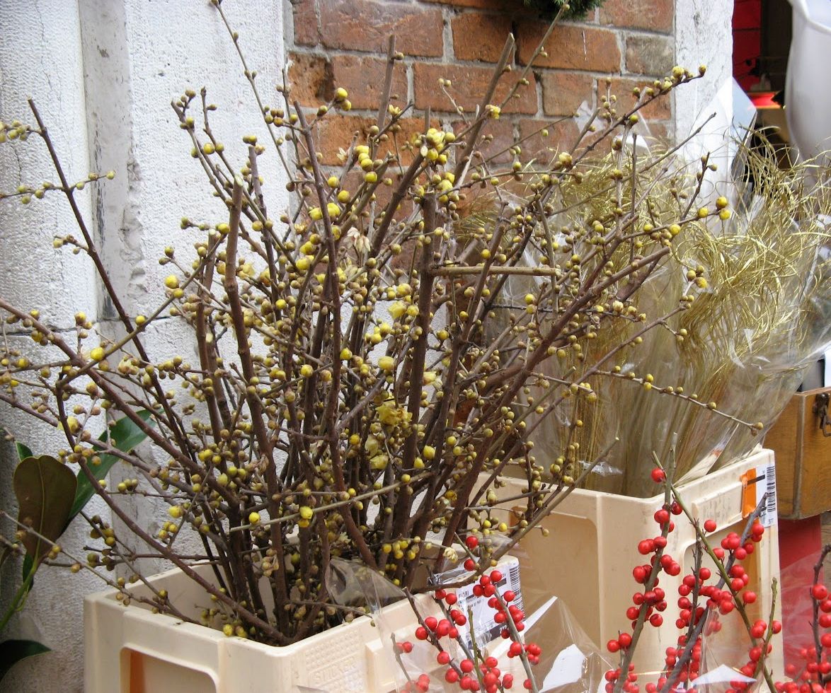 Winter flowers sounds like a contradiction (experts know it’s not) but I was astonished one freezing winter day years ago to find myself walking through a cloud of perfume. That was my introduction to what Lino calls calycanthus — I discovered later that it is “Chinese winter bloom” (Chimonanthus praecox). This is not that particular tree; the one I discovered was almost completely hidden behind a different wall which only made the moment even more magical. If the fragrance wafts past you some frigid night, it verges on celestial. I read that this essential oil is used in some “quality perfumes.” It’s sheer quality all by itself.It begins to bloom in December. Break off a little low-hanging branch, and in the few brief days before the flowers start dropping off your house will smell divine. No, I’m not exaggerating.Lino knew a few places where the shrubs were easy to reach, so he would bring me a few twigs.