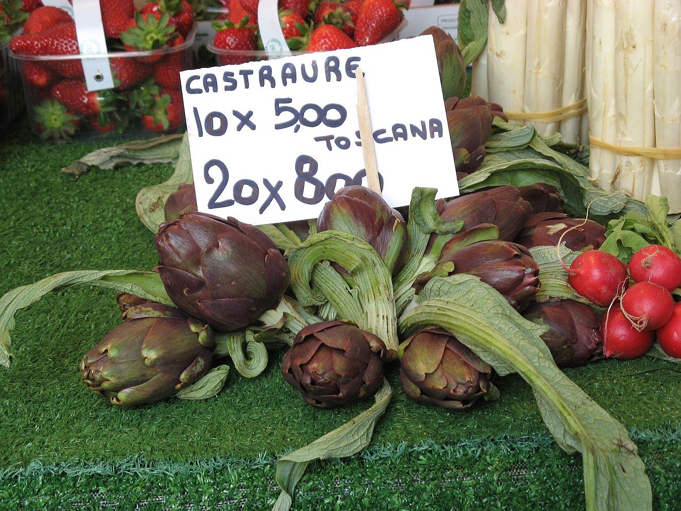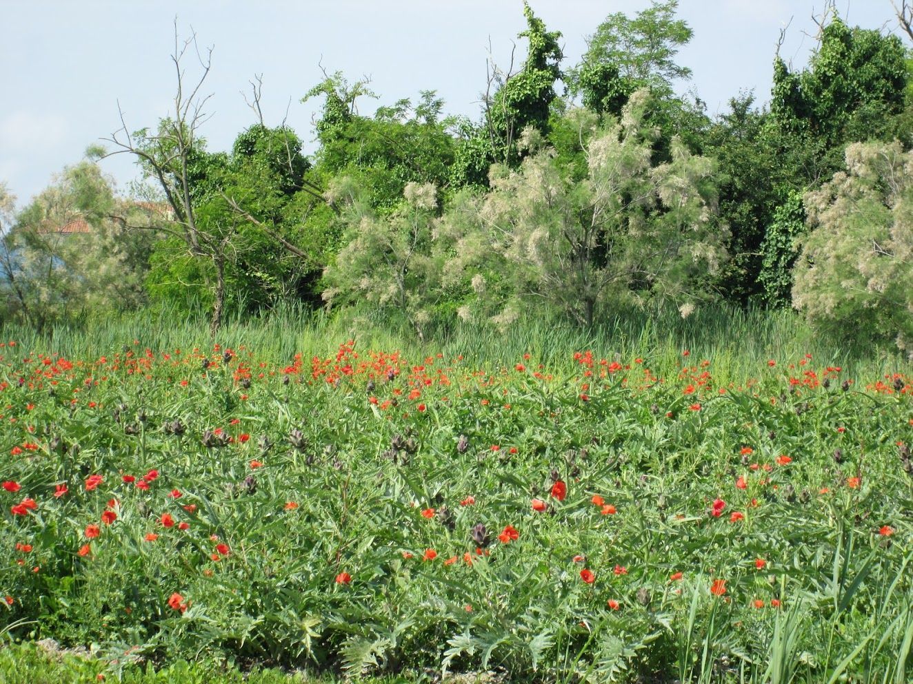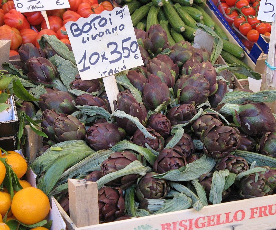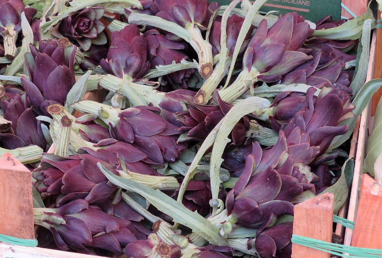 On April 25, San Marco’s feast day, Venetian men go for the rose — the “bocolo” of a rose — and the longer the stem and redder the petals, the better. Your lady-love has to have one. Or else. One year we decided to take mine for a ride.An abandoned bocolo does not bode well,either for the couple or for the rose.Toward the end of April the forsythia takes center stage. This is an approximate date, of course; it comes out when it’s good and ready to come out.May: Poppies on Sant’ Erasmo.Poppies are everywhere for too brief a time.Yes, artichokes are flowers. These are a few castraure (cahs-trah-OO-reh) of the renowned Violet Artichoke of Sant’ Erasmo. Each is the very first bud that appears at the apex of the artichoke plant. People await their appearance sometime between April and May as if a special esoteric treasure is about to be bestowed. Because they now have reached a sort of cult status, it’s truly amazing how many castraure somehow show up in the market. After all, just one per plant … There are various recipes for them, of course, but considering that their primary attribute is their tender youth, they are especially delectable raw, sliced extremely fine and enhanced simply by salt, pepper and the best olive oil you can find. The supply only lasts a mere two weeks or so, then the botoi (BOH-toe-ee) move in.Botoi are the flowers that bloom after the castraura has been removed. They are more flavorful, but they have no PR agent to rhapsodize about them so nobody makes a fuss about botoi the way they do about castraure. Also, there are many more botoi than there are castraure, so they don’t seem quite so exceptional. More than one expert prefers them to castraure, but to each his own mania.To review: The upper crate contains castraure, the lower crate has botoi. They are both delectable.Before we move on, let me alert you to the fact that Italy is rife with artichokes. You will find these on sale in Venice: Castraure from Tuscany. At a very reasonable price, too — another hint that you might have left the Sant’ Erasmo sector. (Castraure from that island, at least the first few days, can cost as much as 2 euros each.)Accompanied by their botoi, noted as coming from Livorno (Tuscany). They actually look just the same to me. But the whole point of this interval is that artichokes are flowers.Tamarisks love salty soil. Besides being lovely they are also very useful; on Sant’ Erasmo they serve as windbreaks around the asparagus and peas and other spring treats.