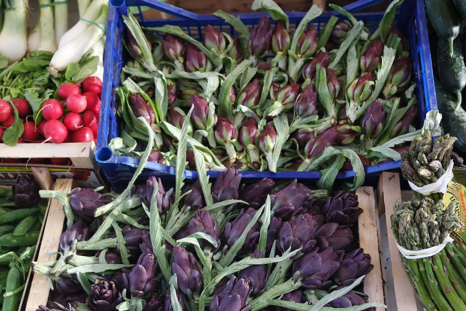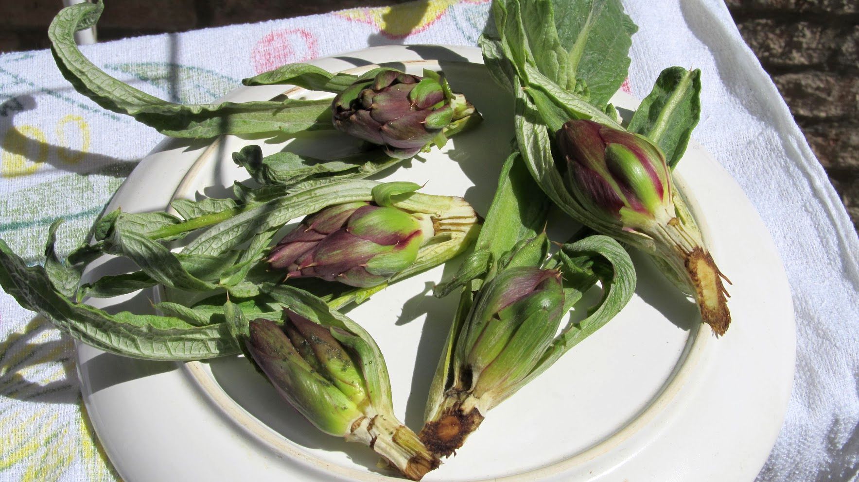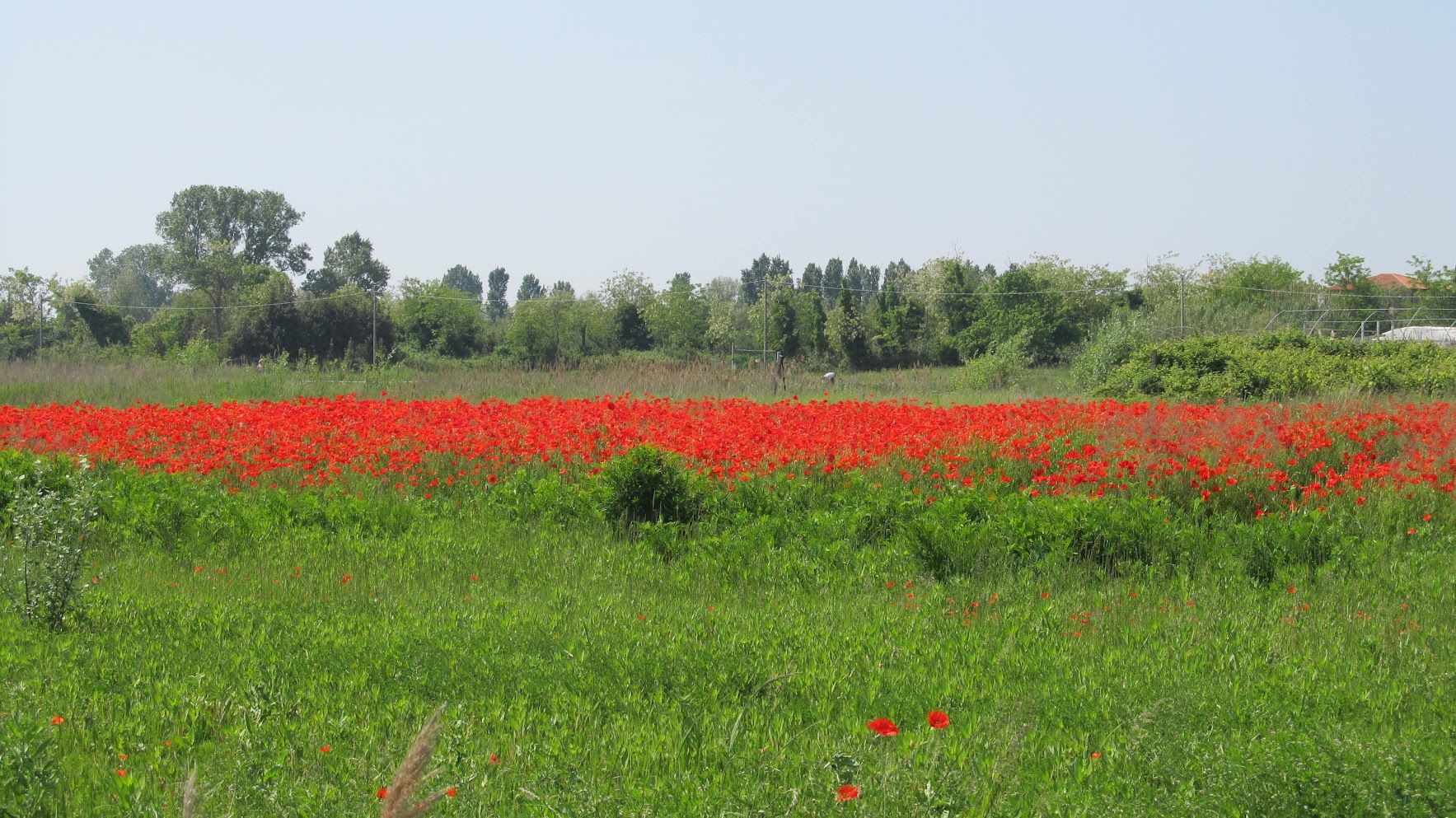 On April 25, San Marco’s feast day, Venetian men go for the rose — the “bocolo” of a rose — and the longer the stem and redder the petals, the better. Your lady-love has to have one. Or else. One year we decided to take mine for a ride.An abandoned bocolo does not bode well,either for the couple or for the rose.Toward the end of April the forsythia takes center stage. This is an approximate date, of course; it comes out when it’s good and ready to come out.May: Poppies on Sant’ Erasmo.Poppies are everywhere for too brief a time.Yes, artichokes are flowers. These are a few castraure (cahs-trah-OO-reh) of the renowned Violet Artichoke of Sant’ Erasmo. Each is the very first bud that appears at the apex of the artichoke plant. People await their appearance sometime between April and May as if a special esoteric treasure is about to be bestowed. Because they now have reached a sort of cult status, it’s truly amazing how many castraure somehow show up in the market. After all, just one per plant … There are various recipes for them, of course, but considering that their primary attribute is their tender youth, they are especially delectable raw, sliced extremely fine and enhanced simply by salt, pepper and the best olive oil you can find. The supply only lasts a mere two weeks or so, then the botoi (BOH-toe-ee) move in.Botoi are the flowers that bloom after the castraura has been removed. They are more flavorful, but they have no PR agent to rhapsodize about them so nobody makes a fuss about botoi the way they do about castraure. Also, there are many more botoi than there are castraure, so they don’t seem quite so exceptional. More than one expert prefers them to castraure, but to each his own mania.To review: The upper crate contains castraure, the lower crate has botoi. They are both delectable.Before we move on, let me alert you to the fact that Italy is rife with artichokes. You will find these on sale in Venice: Castraure from Tuscany. At a very reasonable price, too — another hint that you might have left the Sant’ Erasmo sector. (Castraure from that island, at least the first few days, can cost as much as 2 euros each.)Accompanied by their botoi, noted as coming from Livorno (Tuscany). They actually look just the same to me. But the whole point of this interval is that artichokes are flowers.Tamarisks love salty soil. Besides being lovely they are also very useful; on Sant’ Erasmo they serve as windbreaks around the asparagus and peas and other spring treats.