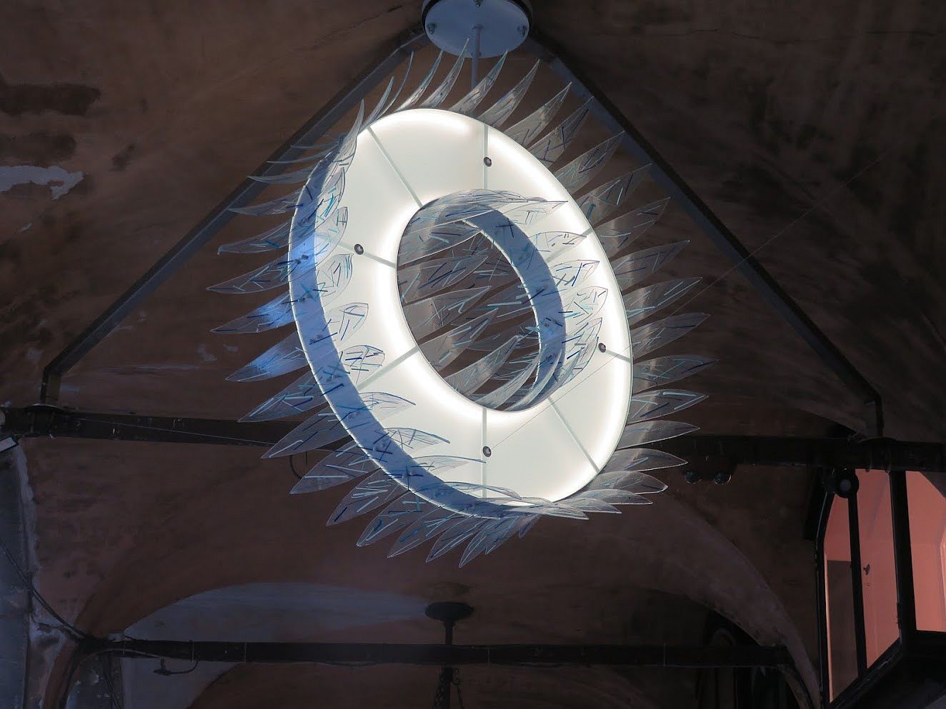 The Abate Zanetti school, with master Eros Raffael. A group work born of the creativity of the young glassmasters. “The chandeliers’ leaves decorated in various shades of blue filaments symbolize the cycle of life. The leaves recall water, the origin of every form, and by their harmonious movement speak of time, the transformation and the eternal continuity of existence.”