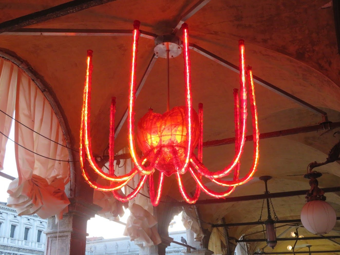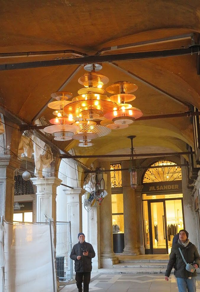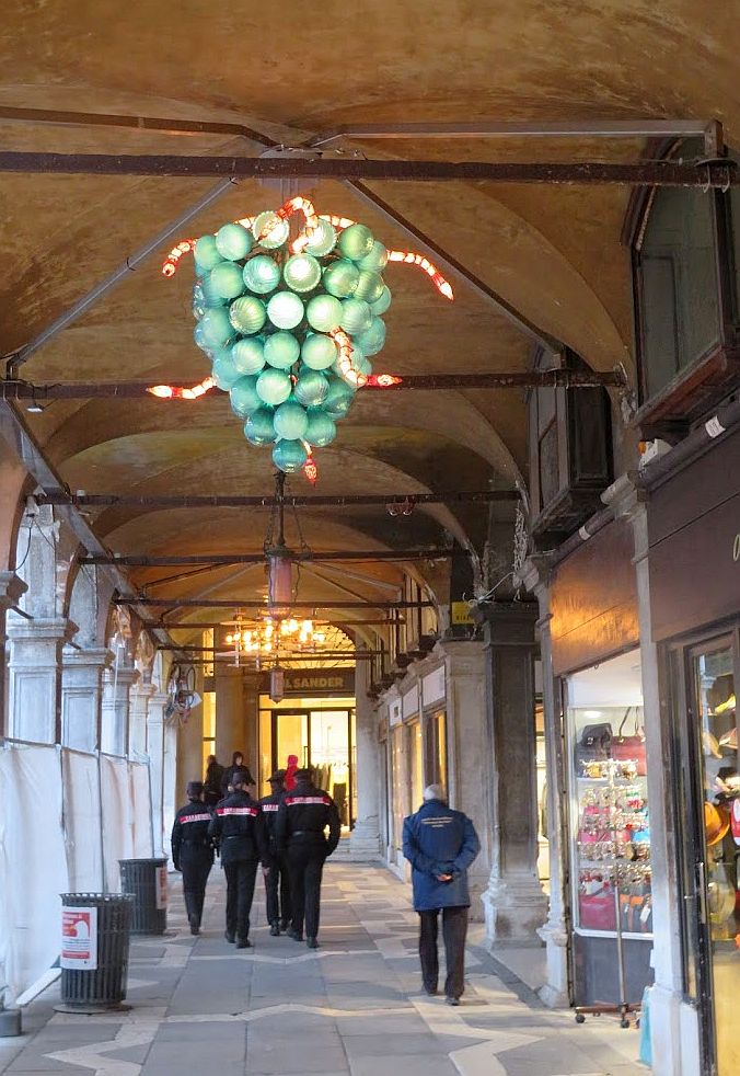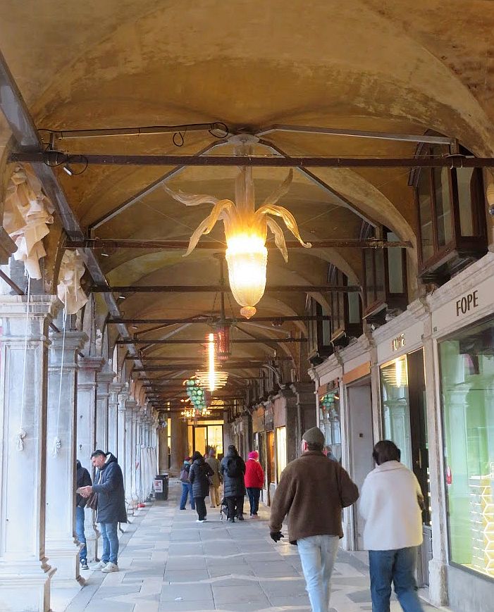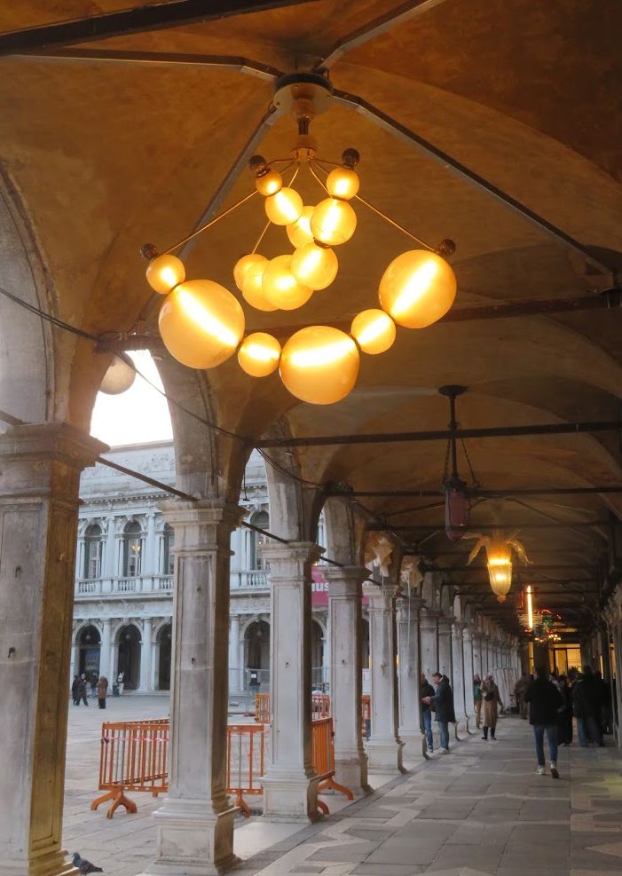 Last November 22 the passageway under the Procuratie Vecchie at the Piazza San Marco lit up with 12 glowing glass chandeliers. Yes, I’m very late to this subject, but I do not go to the Piazza every day, nor do I subscribe to the “Murano Glass Daily Astonisher” (totally made up).