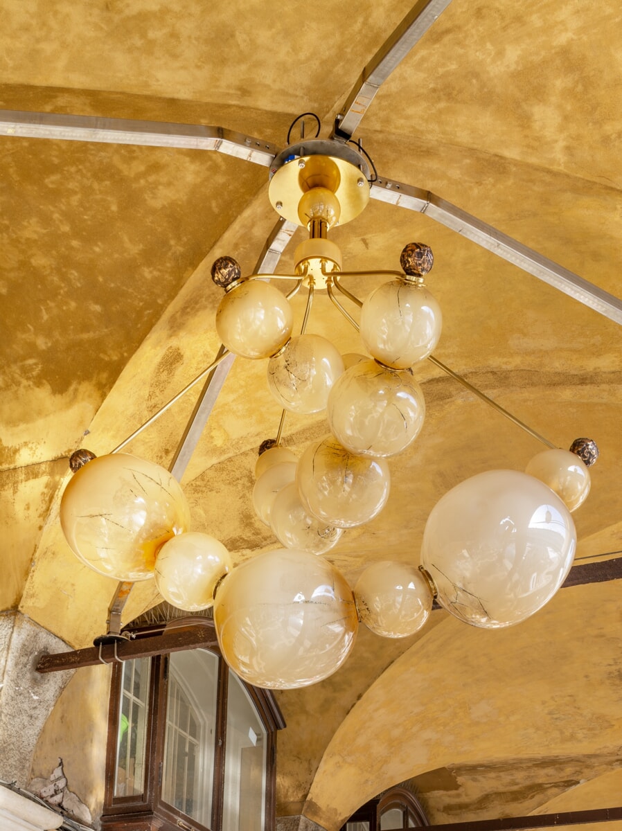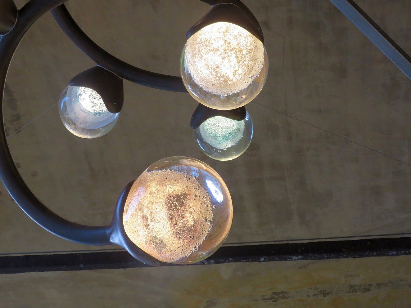 Irene Cattaneo, with Lavorazioni artistiche of Fabiano Amadi. “With its eight handmade “moonlike” spheres, the chandelier is homage to the glassmaking master of Murano, where the classic technique of the submerged entanglement is expertly fused with the use of metallic powder to create a luminous and profound effect.”