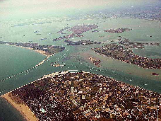 This view shows the lagoon inlet at San Nicolo' on the left; in the middle is the island created for the MOSE project, which has already affected tidal behavior. "Bacan'" is the beige area in the big channel to the right, a swath of mudbanks with a temporarily exposed islet fronting the lower edge of the island of Sant' Erasmo. (Photo: Chris 73, Wikimedia Commons).