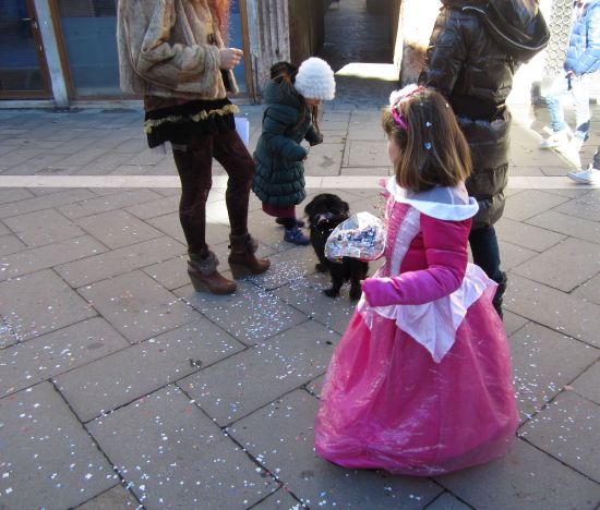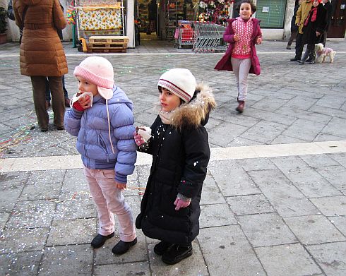 Actually, there is one thing which I love about it, and that thing is kids. The neighborhood tykes with their painted-on whiskers and frilly tulle princess costumes and especially their fistfuls of confetti (here called coriandoli).