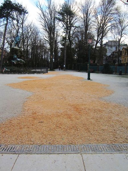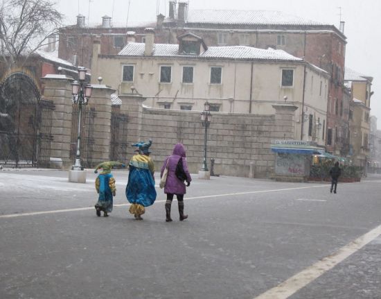 Our first clue that something out of the ordinary was on the way was the work that went on one morning to fill in the depressions in the long gravelly walkway toward the lagoon known as the “Viale Garibaldi.” Being as heavily traveled as Grand Central Terminal by people going to and from the Giardini vaporetto stop means that it has long since been worn down into assorted shallows. These weren’t so apparent in dry weather, but when it rained, we called this stretch of Venice “Bacan’,” after our favorite lagoon mudbank. You could see the same rises and depressions in the ground, interspersed with pools of water. This particular patch became a lake. Great work! Whatever came over them? Did somebody suddenly find thousands of euros that had fallen between the cushions of the sofa?Then the kids, the dogs, and the confetti began to come out into the sunshine. (Yes, the sun did shine occasionally. Just enough to make you miss it when the next wave of weather passed over us.)A little executioner out for a stroll with his grandfather, looking for someone to dispatch.Kids get started early in the dressing-up game — not that they need any help or encouragement.We had noticed a stage and small soccer area being set up over the course of two days, and a crowd gathered to see the first match of a new Carnival diversion called the “Palio dei Sestieri,” roughly the Trophy of the Sestieri, which are the six districts of Venice. The teams were made up of boys organized in teams of increasing age over a few days, and they played “calcetto.” It’s regular soccer, but with only five players, not eleven, per team. For the record, at the end of the series our very own sestiere, Castello, took home the victors’ cup. Coincidence? I really hope so.Excellent block by the goalkeeper of the Dorsoduro team. I can tell you that hurling himself to the ground to intercept the ball wasn’t any fun on the granite paving stones. But all the goalkeepers did it. Bruises. Contusions. Fun.And of course there was a half-time show, to music.At the next break, another show, this time with smaller dancers and big pompoms. Go Big Red!One morning around 9:30 I got on the #1 vaporetto heading uptown. At the Arsenale stop, several exceptional Beings boarded, going (I thought) to San Marco to display themselves. All normal so far, except that one Being was wearing wings with plumes, which stretched out as far as her/his arm on each side. (There is a person in there, between the wings.) Needless to say, this occupied an amazing amount of space which nobody else could use. I’m accustomed to luggage taking up square yards of space, but it’s not often a costume is so big that it probably ought to pay for an extra ticket. Every time he/she turned around, people stood back.This very impressive quartet got off at the train station. Maybe they had to catch a train back to Brigadoon. They are a good example of the people who give Carnival everything they’ve got, though I didn’t hear what language they were speaking. Maybe when you’re dressed like this, speaking is superfluous.Last Sunday morning saw the traditional (by now) regata in costume organized by the Settemari club. These were the two front-runners, as they sped past us approaching the Rialto Bridge.My friend, Antonella Mainardi, rowing like mad as Her Britannic Majesty, led by her faithful corgi, steered by her faithful prince. The backwash from a passing vaporetto created a brief challenge to her nearest competitors, a pair from the Giudecca rowing club decked out as a pair from the Giudecca rowing club. No points for creativity there.And on they sped, providing a highly wrought spectacle for the gondola hordes. And the gondoliers, too.Monday, the next-to-last day of Carnival, we got mega-weather. But it wasn’t yet up to speed in the mid-afternoon, when these intrepid revelers headed out to find some frivolity somewhere. Snow means nothing when you’ve only got 48 hours left to party.It snowed all day, gradually intensifying, with a northeast wind that blew up to 30 mph (50 km/h). That’s why all the snow is sticking to the east parapet of this bridge; the other side was completely clear.The slick packed slush on our bridge was inviting anyone who crossed to slip and fall and break something.Via Garibaldi looked like the Great White Way. Amazing how hard it is to walk on deepening wet snow, even if you do have the wind at your back. The return was even more amusing.Garibaldi on his pedestal, unimpressed, unimpressible. Perhaps nobody had yet advised him that the Tide Center was predicting an exceptional acqua alta tonight: 160 cm. Of course, why would he care? He lives on the third floor.We, sad to say, do not. We live on the ground floor, and while we are high enough to stay dry with a tide that reaches 150 cm, after that, it’s all hands to man the pumps. Or to be more precise, put all our belonging up on something. Here, the contents of a few bookshelves and God knows what else are up on the sofa, and sofa is up on two plastic storage boxes, and if the storage boxes get wet, they’re on their own.And everything at high-tide-level in the bedroom was up on the bed, including whatever was on the closet floor, and the lowest drawers of the three bureaus. High water: Romantic? Dangerous? I’m going with “damned nuisance.”But we had no worries about the appliances, having learned several years ago that when the water comes in, it makes itself comfortable everywhere. So we had exerted ourselves a year ago to take measures to protect them from dampage.But we were reprieved! The next morning the world was smiling again. The wind had changed direction when the tide turned (signaled by a single thunderclap), and the water only came up to 143 cm. However, we had to stay up till 12:15 to know this. These high-water vigils only seem to take place in the dead of night. Waiting for the water to turn around and go out is like sitting by somebody’s b