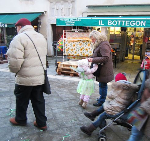 So far, I haven’t seen costumes or makeup, but the Carnival spirit has already begun to simmer along via Garibaldi. Fritole and galani are already on sale, and I’ve heard the distant cries of tiny swarming humans. And they’ve left their gladsome spoor along calli and campi. There is no day so dull that it could not be brightened by these bits of colored paper.