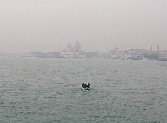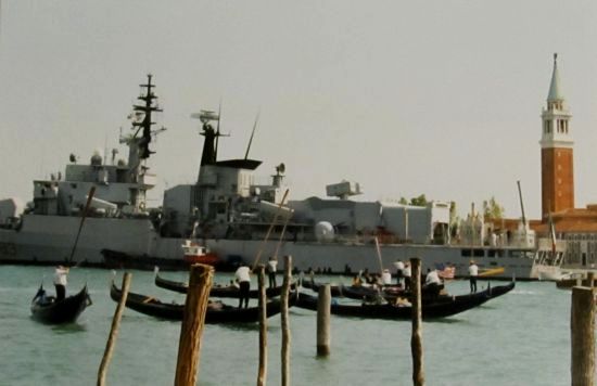 A number of gondoliers came out to raise their oars in the traditional Venetian salute. It was mere coincidence (I think) that there was an Italian warship in the harbor.