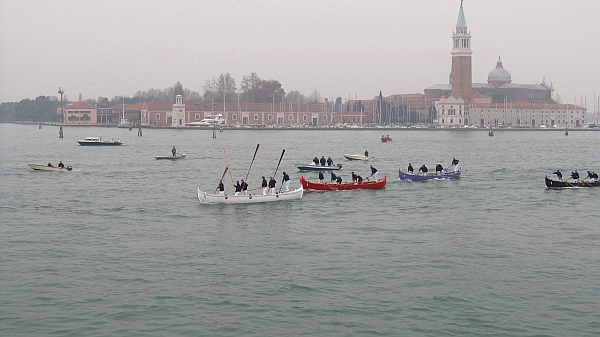 The course was inverted this year, as the tide was coming in (it’s always much better to start against the tide), so the race started in front of the Piazza San Marco, proceeded at a great rate toward Sant’ Elena, where the boats rounded the buoy and headed toward the finish at the Arsenal. The first two boats are already battling it out, while the team on the pink boat is probably discussing what to give their girlfriends or wives for Christmas. Not much else to talk about back there.I’m sorry we can’t hear what opinions the teams on the first two boats are sharing with each other. Believe me, there can be as many insults yelled at your teammates as at your opponents, even if you’re in the lead.