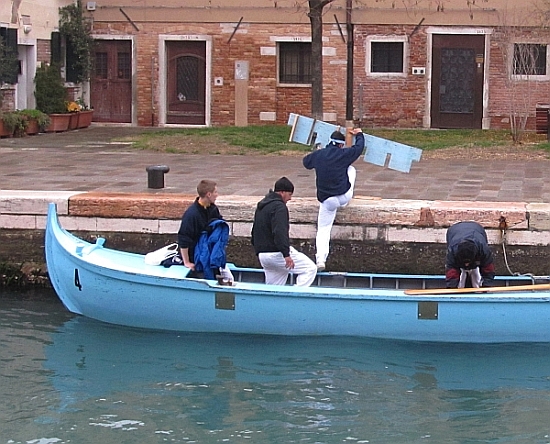 The crew of each boat was composed of four gondoliers who had done their (formerly compulsive) military service in the Navy, plus one boy from the Scuola Navale Militare F. Morosini, where Lino teaches rowing. For the first time in 15 years, there was also one fireman.